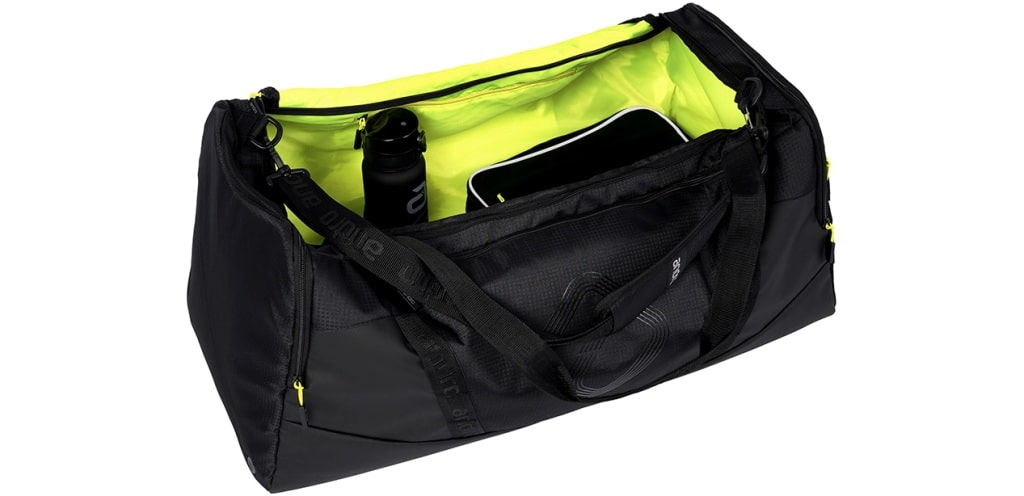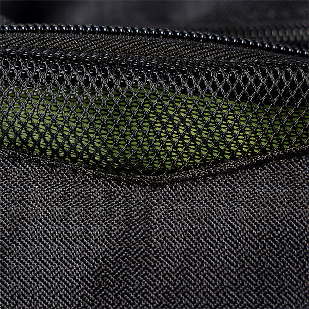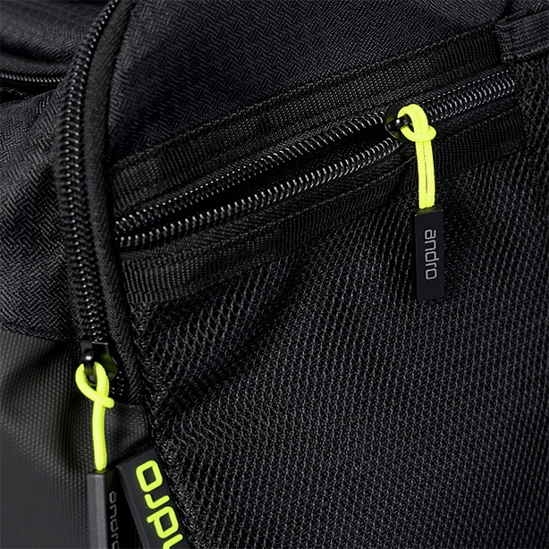 - Side compartment with zip. Small zipped mesh pocket on top and mesh pocket with elasticated drawstring for stowing water bottles.