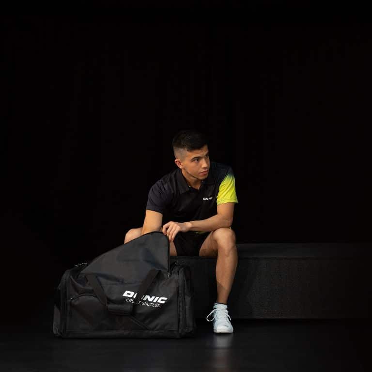 Large tournament bag with large main compartment, 2 large outer compartments and 2 zipped compartments on the front and back. High-quality polyester jacquard material.
