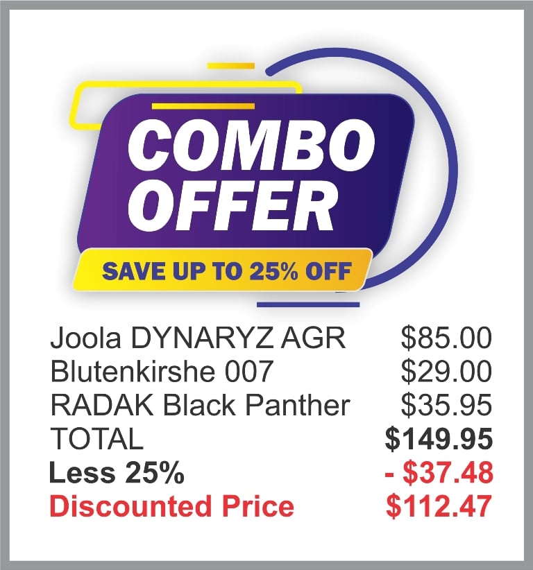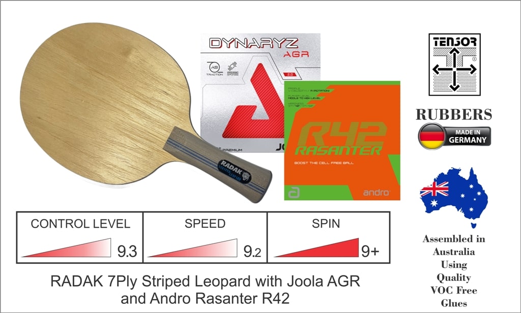 Look no further, we have paired one of our most popular selling Offensive – Blades with Joola’s newest rubber Dynaryz AGR, on the forehand, that produces an enormous amount of Spin. And Andro’s tried and tested Best Spin/Speed rubber “Rasanter R42” on the backhand for best blocking and pushing and control looping.
