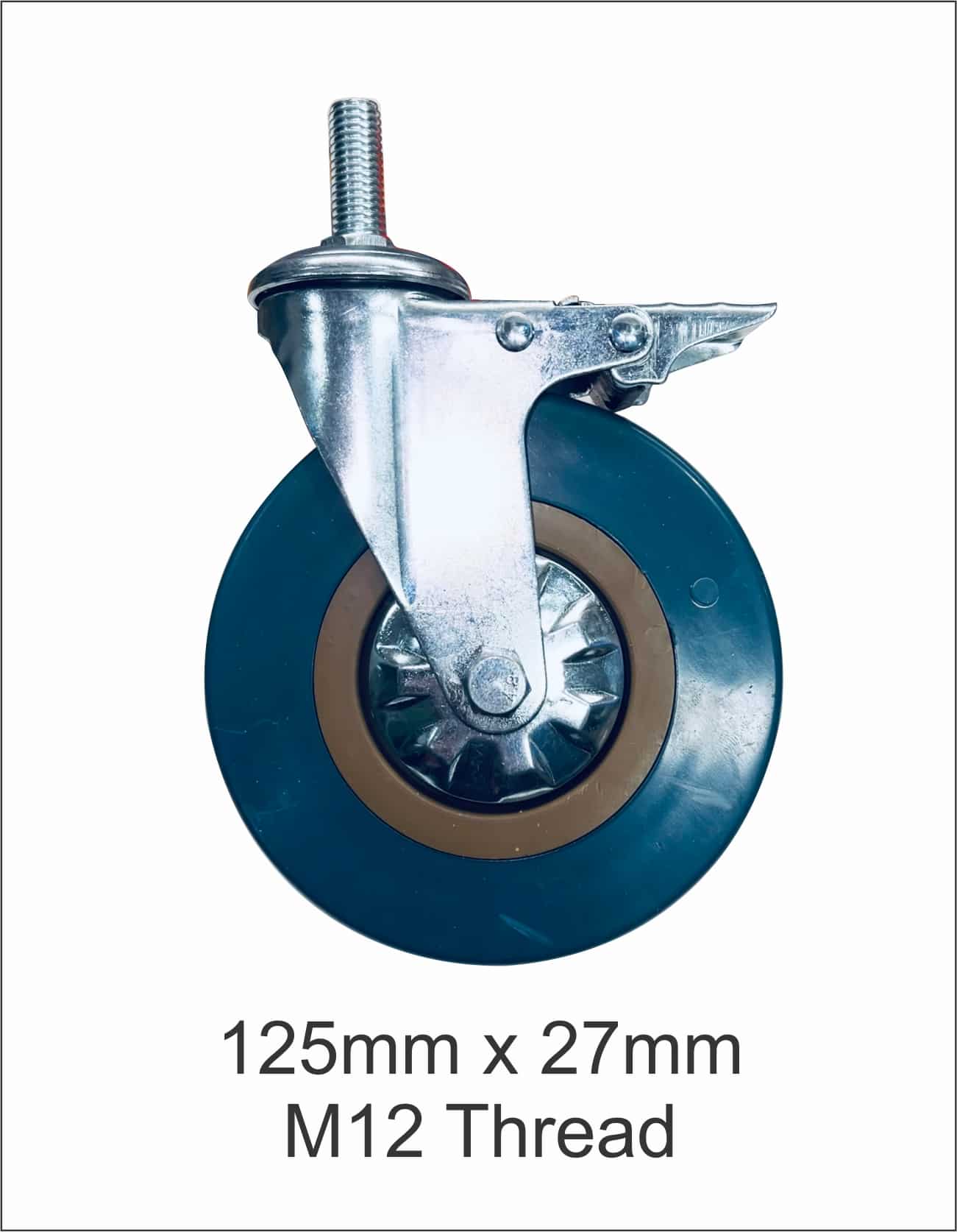 125mm x 27mm (normally stamped on the rubber section of the wheel