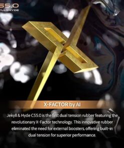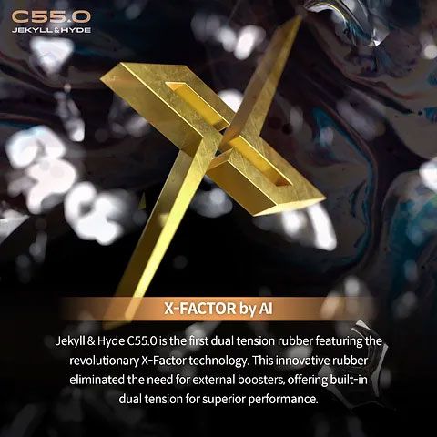 We developed Jekyll & Hyde C55.0. This is the first dual tension rubber with X-Factor that doesn’t require booster and is already built-in. This was made only possible by Artificial intelligence. Jekyll & Hyde C55.0 has a thicker top sheet, shorter pimples, and a more compact pimple arrangement.