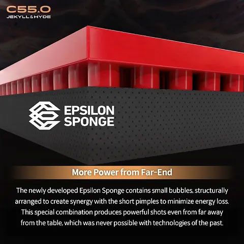 The newly developed Epsilon Sponge contains small bubbles, structurally arranged to create synergy with the short pimples to minimize energy loss. This special combination produces powerful shots even from far away from the table, which was never possible with technologies of the past. - Jekyll & Hyde C55.0 – Reach the Level you’ve always dreamed of.