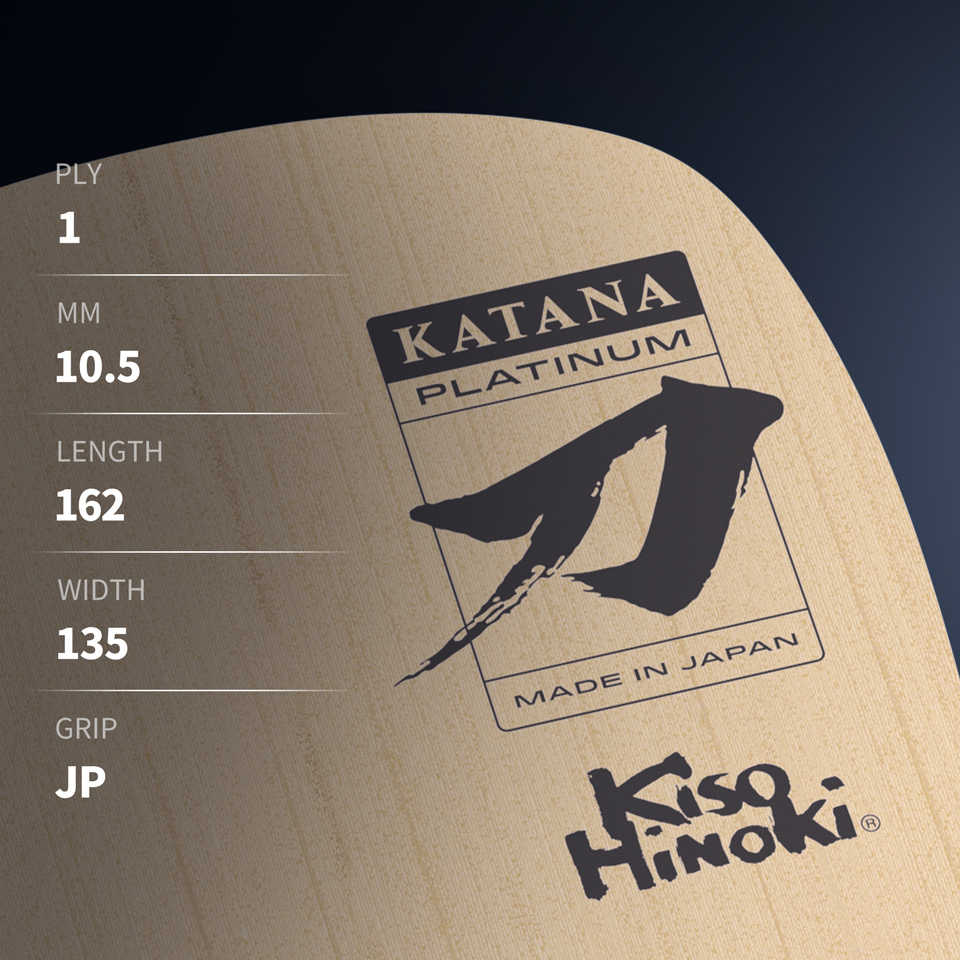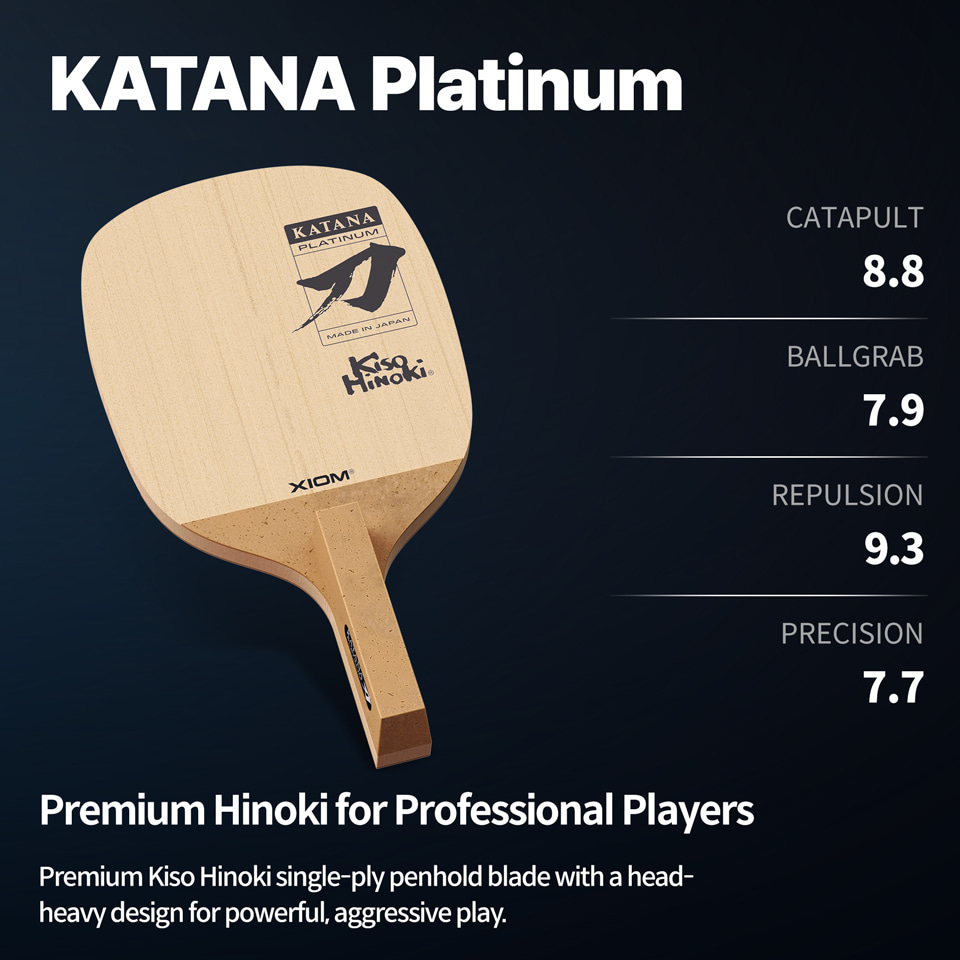 Premium Kiso Hinoki single-ply penhold blade with a head-heavy design for powerful, aggressive play.